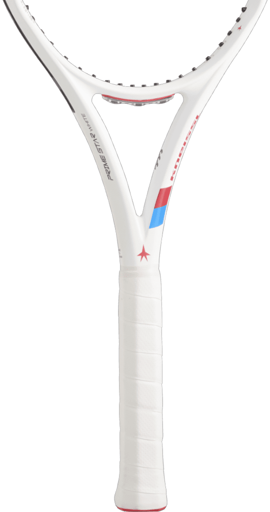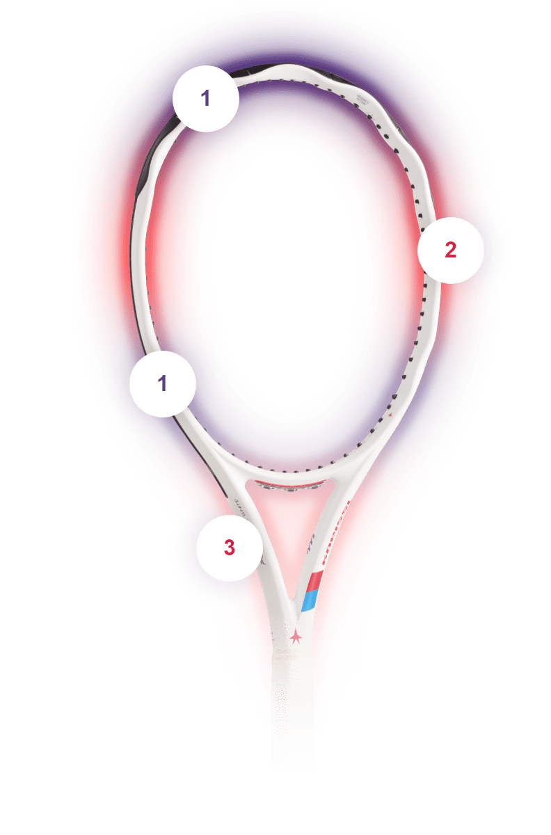 波型凸⾯フレームは従来の直線形状のフレームと⽐べ、フレームの厚い部分と薄い部分が存在する。薄い部分は空気抵抗を受ける表⾯積が少なくなるため、⼀般的には中厚(⾼反発系)ラケットに分類される設計のPRIME STARだが、フレームの厚みを感じることなくシャープにスイングすることができ、コントロール系ラケット並みの操作性が獲得できる。これによりスピン性とコントロール性も⾼い⽔準で表現が可能になり、今までにない安定感を発揮。
